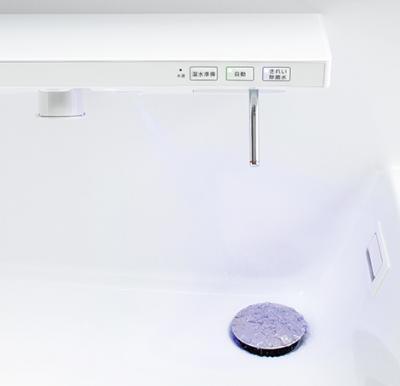 ボタンを押すとTOTOのクリーン技術「きれい除菌水」が吹きかけられ、歯ブラシや排水口の汚れ・菌を抑えます。そのため洗面所をいつも気持ちよく使えます。