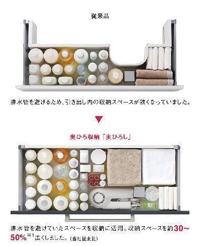 排水管の位置や構造などの工夫により、広く使いやすい収納スペースを確保しています。