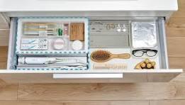 フルスライドタイプに洗面小物をすっきり収納できるスマートトレイ(樹脂製・金属製)を装備。