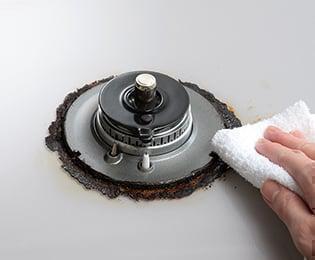 バーナーまわリは、煮こぼれなどがこびりつき、お手入れに時間がかかる…。バーナーからの輻射熱で熱くなることが原因です。温度軽減効果があるトップレートなら、バーナー周りがこびりつきづらく、お手入れをラクにします。