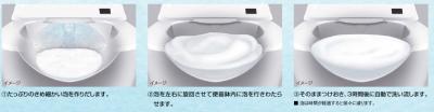 たっぷりのきめ細かい泡を作り、泡を左右に旋回させて便器鉢内に行き渡らせ、そのままつけ置き3時間後に自動で洗い流します。