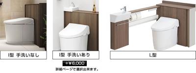 トイレの後ろにキャビネットがあるタイプのI型と、トイレの後ろにキャビネット&横面にペーパーホルダーやタオル掛け・手洗い器がついたL型がございます。