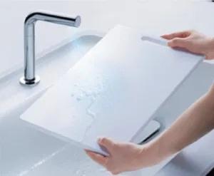 TOTOのキッチン「クラッソ」ではこの「きれい除菌水」を生成できる水栓が搭載されていて、ごみの網かごやまな板、包丁、布巾などに吹きかけて手軽に除菌できのが魅力です。