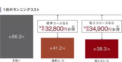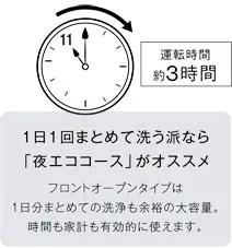 ヒーターの電力を抑えながらゆっくり洗浄・乾燥し、寝ている間に運転します。標準コース→約41.2円に対して、夜エココースは約38.3円と節約できます。毎日のことなので節約効果も大きいですね。