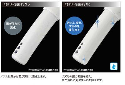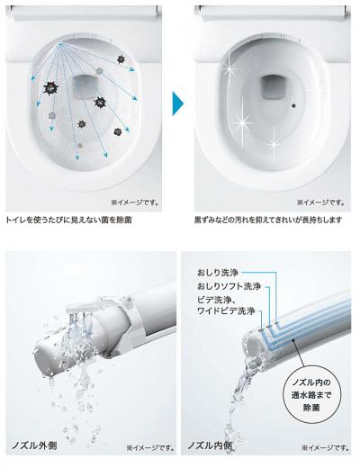 また、外出中や就寝中も「きれい除菌水」を吹きかけて自動的に除菌して便器とノズルを除菌してきれいを保ちます。