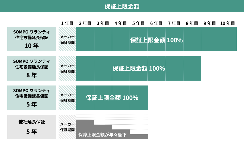 延長保証サービスの保証上限金額は、商品金額(税込)までとなり、経過年数による低下はございません。