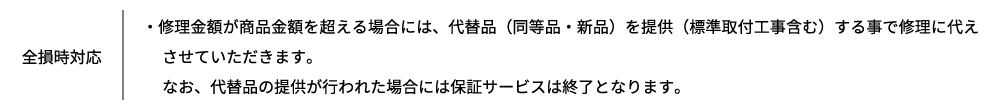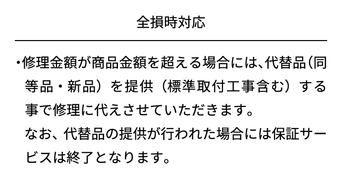 また、万が一修理金額が保証上限金額を超える場合には、代替品(同等品・新品)を提供することで修理に代えさせていただきます。 なお、代替品の提供が行われた場合には保証サービスは終了となります。