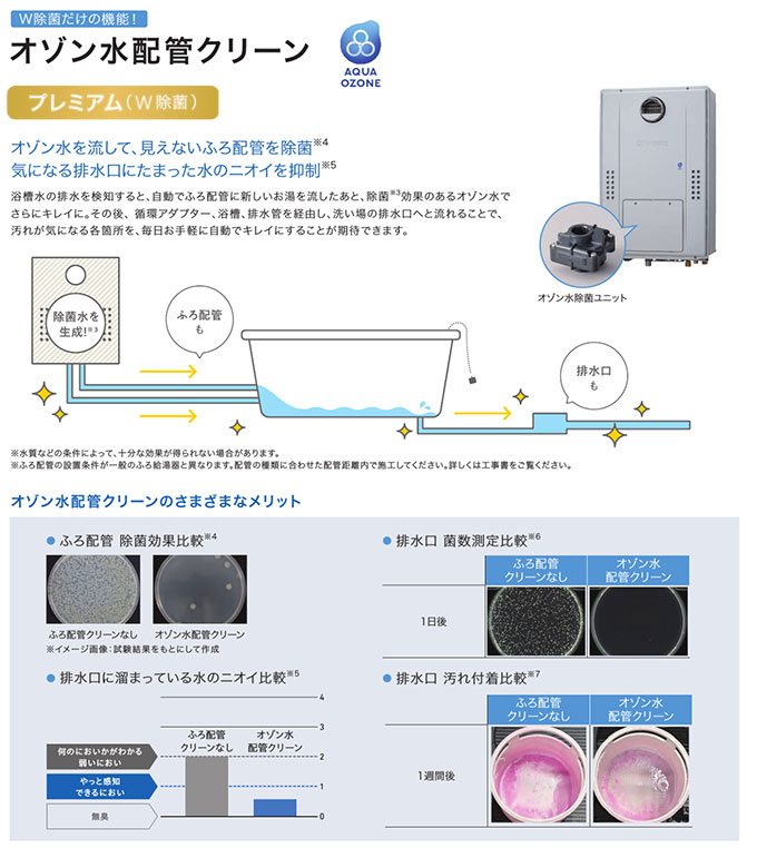 ◆「オゾン水除菌ユニット」は除菌するものであり、汚れを落とすものではありません。また全ての菌に作用するものではありません。 ※4[試験機関](株)衛生微生物研究センター[試験番号]2022D-BT-80009[試験方法]内壁に試験菌液を付着させたふろ配管に対し「オゾン水配管クリーン」を実施。 [試験結果]未実施時との比較で生菌数が99%以上減少。(実使用での実証効果ではありません。使用環境により効果は異なります。) ※5[試験機関](株)ノーリツ[試験方法]おとな4人が180L、40℃設定のふろに各10分間入浴後排水。「オゾン水配管クリーンあり」の場合と「ふろ配管クリーンなし」の場合の、排水口に滞留した水を採取し、水のニオイを6段階臭気強度表示法にて評価。[臭気測定機関](株)総合水研究所[試験番号]N2304657 [試験結果]6段階臭気強度にて「オゾン水配管クリーンあり」は0.5、「ふろ配管クリーンなし」は2。(実使用での実証結果ではありません。使用環境により効果は異なります。) (実使用での実証効果ではありません。使用環境により効果は異なります。) ※6[試験機関](株)ノーリツ[試験方法]おとな4人が180L、40℃設定のふろに各10分間入浴後、排水。「オゾン水配管クリーンあり」の場合と「ふろ配管クリーンなし」の場合の、排水口に滞留した水に試験片を漬け置き、1日経過後の試験片表面を検査キットで拭き取り、残存した菌数を測定。[菌数測定機関](株)総合水研究所 [試験番号]N2306374(実使用での実証結果ではありません。使用環境により効果は異なります。) ※7[試験機関](株)ノーリツ[試験方法]おとな2人が1週間毎日洗い場で洗体。「オゾン水配管クリーンあり」の場合と、「オゾン水配管クリーンなし」の場合の排水口の汚れ具合を比較。(汚れがわかりやすいように、タンパク質成分を染色しています。)