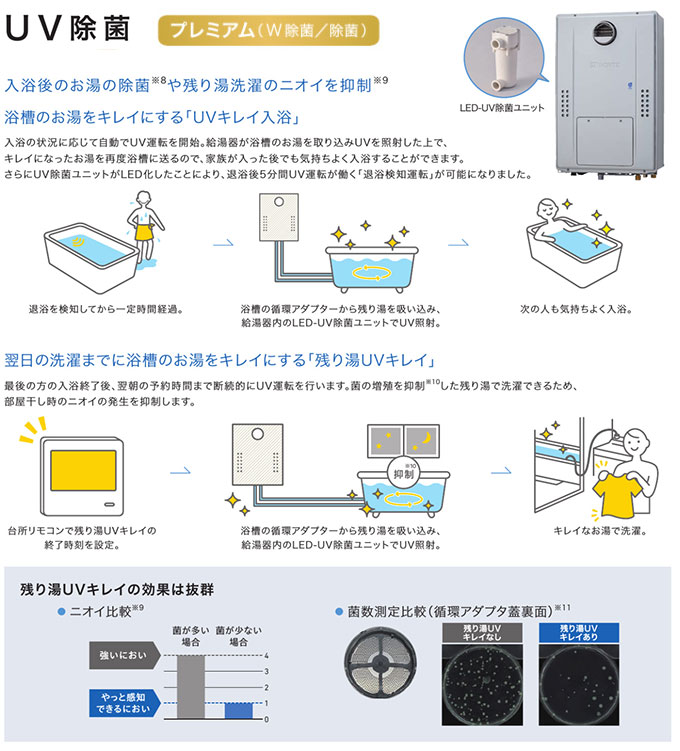 ◆「LED-UV除菌ユニット」は除菌するものであり、汚れを落とすものではありません。また全ての菌に作用するものではありません。 ※8[試験機関](株)衛生微生物研究センター[試験番号]2021D-BT-10075[試験方法]180L、40℃の試験液が入った試験浴槽においてLED-UV除菌ユニットを循環運転。流量9.5L/min。 [試験結果]72分後で99%以上抑制。(実使用での実証結果ではありません。使用環境により効果は異なります。) ※9[試験機関](株)衛生微生物研究センター[試験番号]28D-BT-273[試験方法]におい原因菌が付着した試験布を6段階臭気強度表示法にて評価。 [試験結果]「1.5X106(cfu/mL)の試験液に浸した布」:臭気強度4、「1.8X104(cfu/mL)の試験液に浸した布」:臭気強度1(実使用での実証効果ではありません。全ての菌に効果があるわけではありません。菌の種類・対象物の素材により効果は異なります。) ※10[試験機関](株)衛生微生物研究センター[試験番号]2021D-BT-10075[試験方法]180L、40℃の試験液が入った試験浴槽において「残り湯UVキレイ」を実施。流量9.5L/min。 [試験結果]14時間後、運転なしとの比較で99%以上抑制。(実使用での実証効果ではありません。使用環境により効果は異なります。) ※11[試験機関](株)ノーリツ[試験方法]おとな4人が180L、40℃設定のふろに各10分間入浴。「残り湯UV キレイあり」の場合と「残り湯UV キレイなし」の場合の、循環アダプタ裏面を検査キットで拭き取り、残存した菌数を測定。[菌数測定機関](株)総合水研究所[試験番号]N2501177(実使用での実証実験ではありません。使用環境により効果は異なります。)